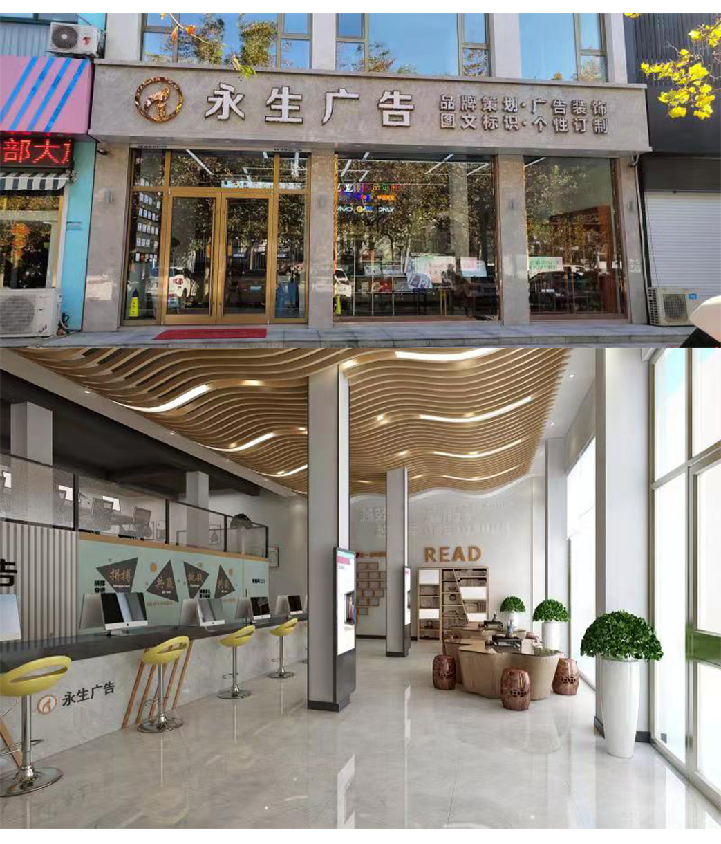 公司自有數(shù)碼沖床設(shè)備、500W光纖機(jī)、高精度大幅面噴繪機(jī)、寫(xiě)真機(jī)、UV機(jī)、多種大小型雕刻機(jī)、吸塑機(jī)、全自動(dòng)圍字機(jī)、自動(dòng)開(kāi)槽機(jī)、激光焊接機(jī)、拋光機(jī)等生產(chǎn)加工設(shè)備,擁有完善的設(shè)計(jì)團(tuán)隊(duì)、技術(shù)團(tuán)隊(duì)、施工團(tuán)隊(duì)、售后團(tuán)隊(duì),可為廣大客戶提供室內(nèi)裝修、店招門(mén)頭、精神堡壘、黨建標(biāo)識(shí)、標(biāo)識(shí)標(biāo)牌、宣傳欄、LED顯示屏、警示標(biāo)識(shí)、精品字、證卡胸牌、證書(shū)獎(jiǎng)杯、燈箱、桌牌、定制禮品、展具、噴印等多種專業(yè)廣告服務(wù)...